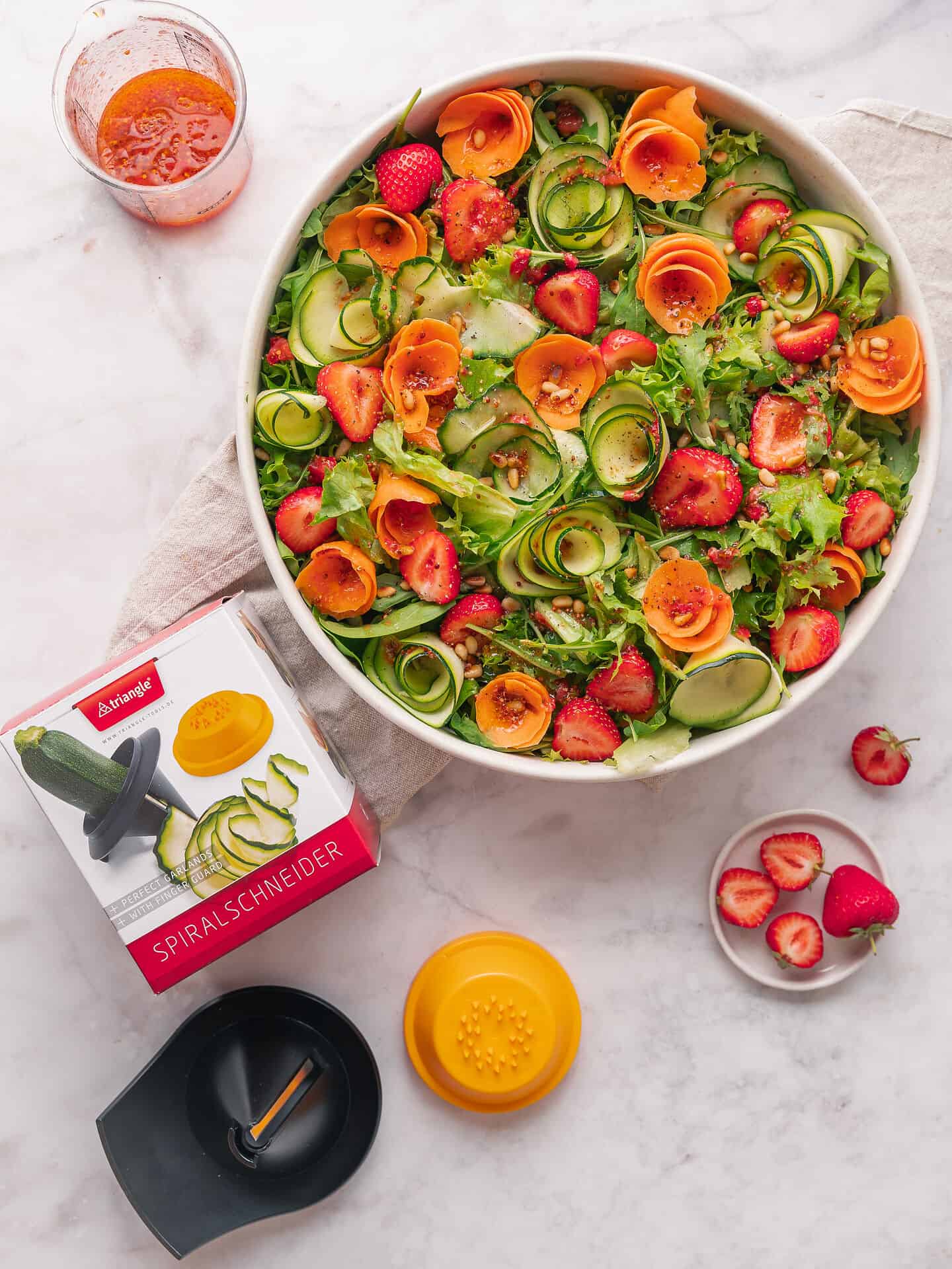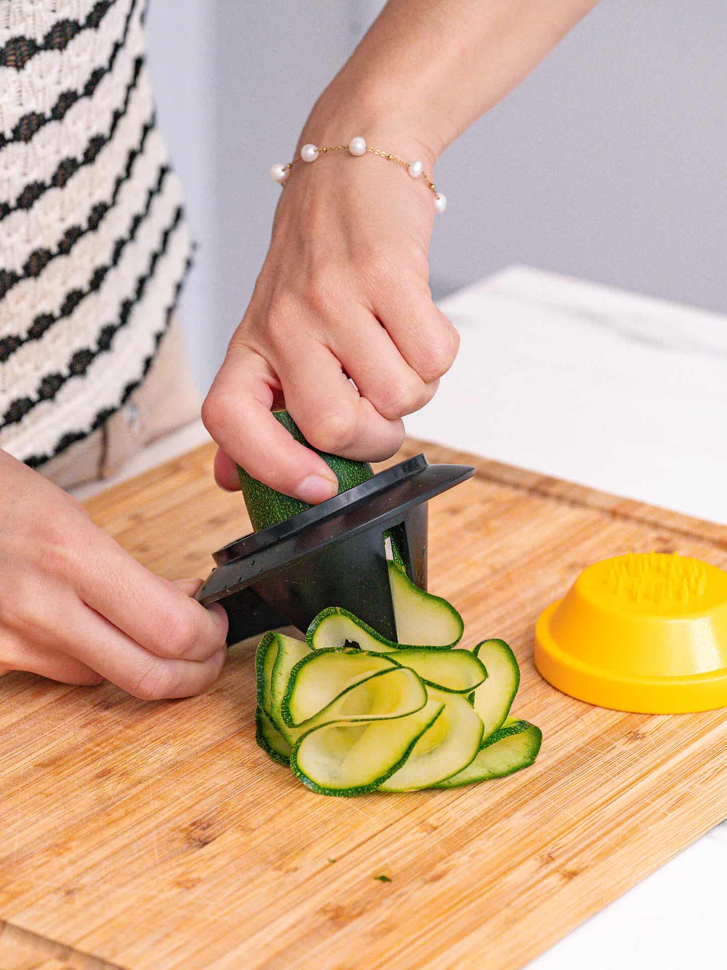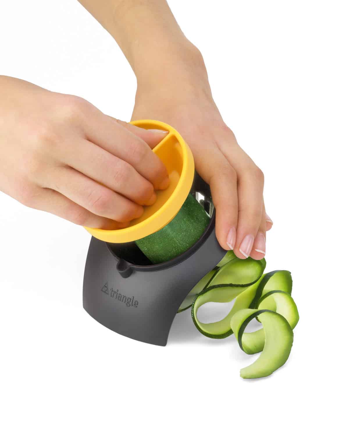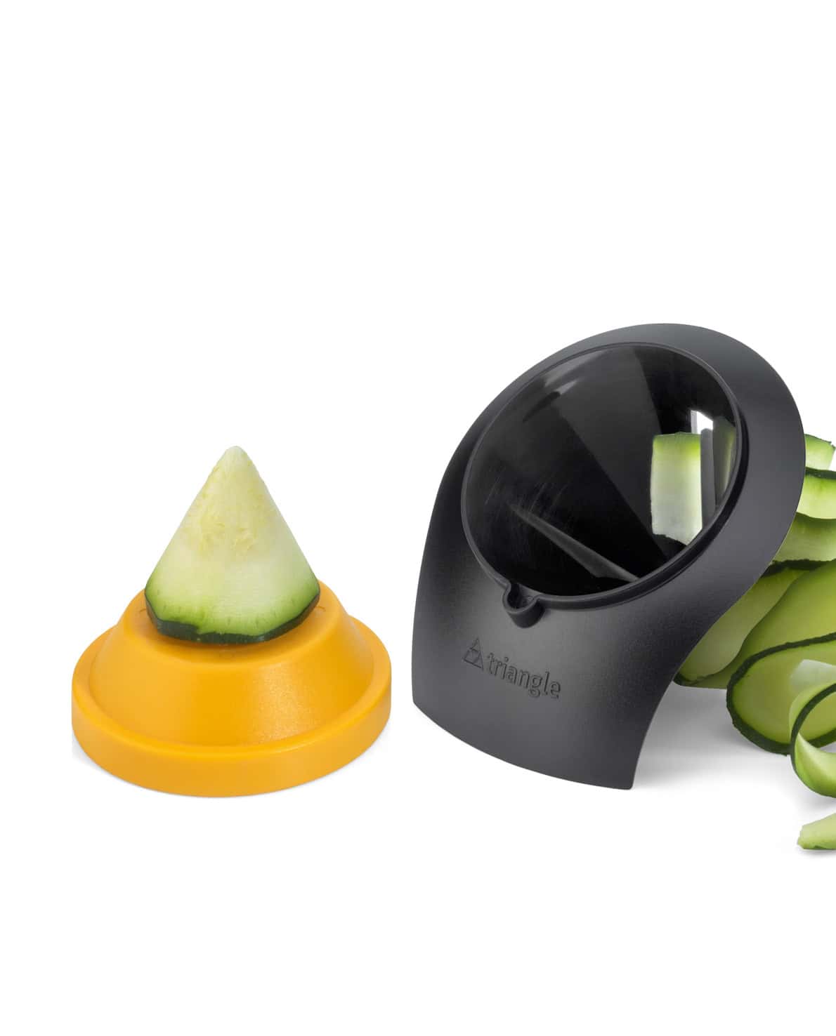 For easy cutting vegetable garlands of 6 cm width. For best results set the cutter on its foot and position it with one hand. Use the other hand to stick fruit and vegetable into the cone. Start rotating. An end holder helps to process the end pieces for minimum loss. Hard plastic and stainless steel, 10 x 8,5 x 9 cm, cone Ø 7,5 cm, hardened stainless steel blade, dishwasher-safe.