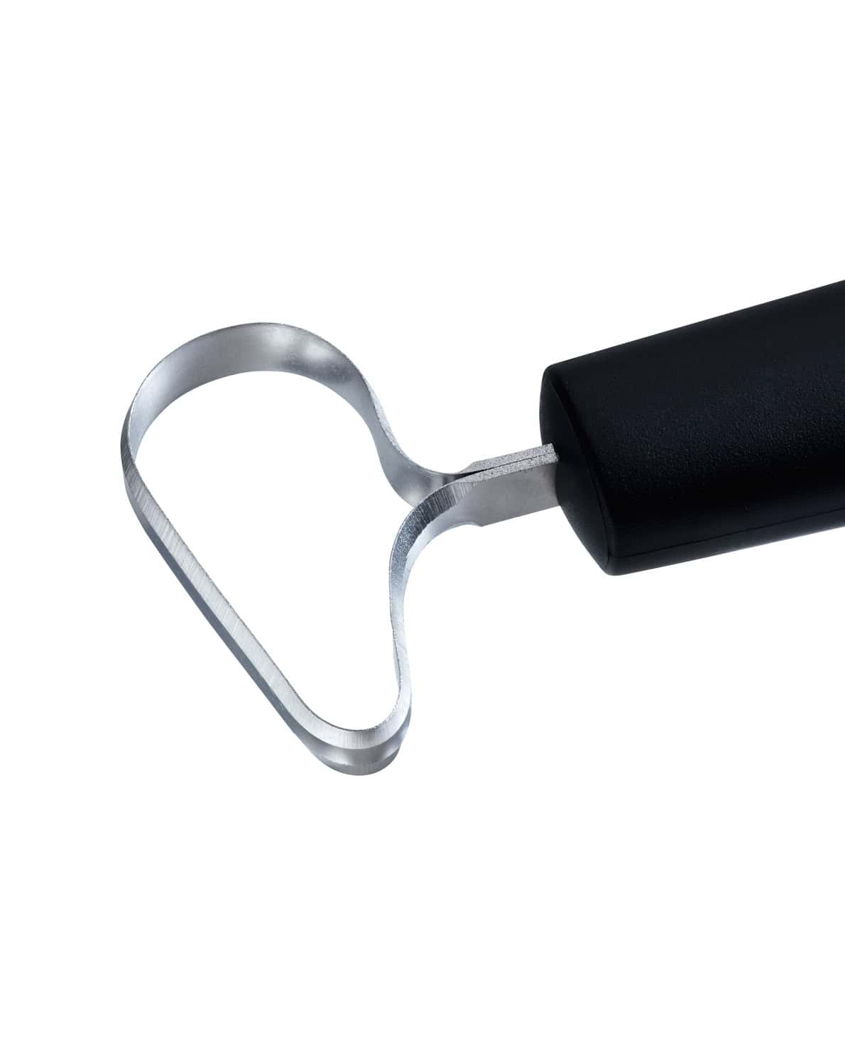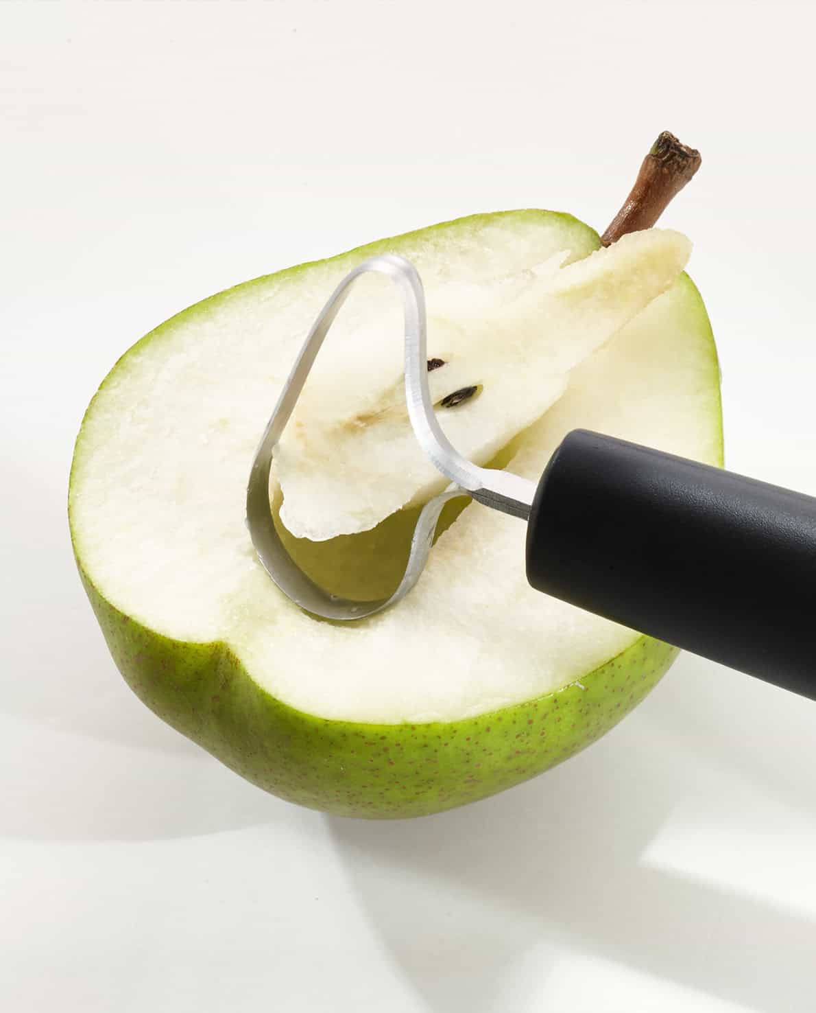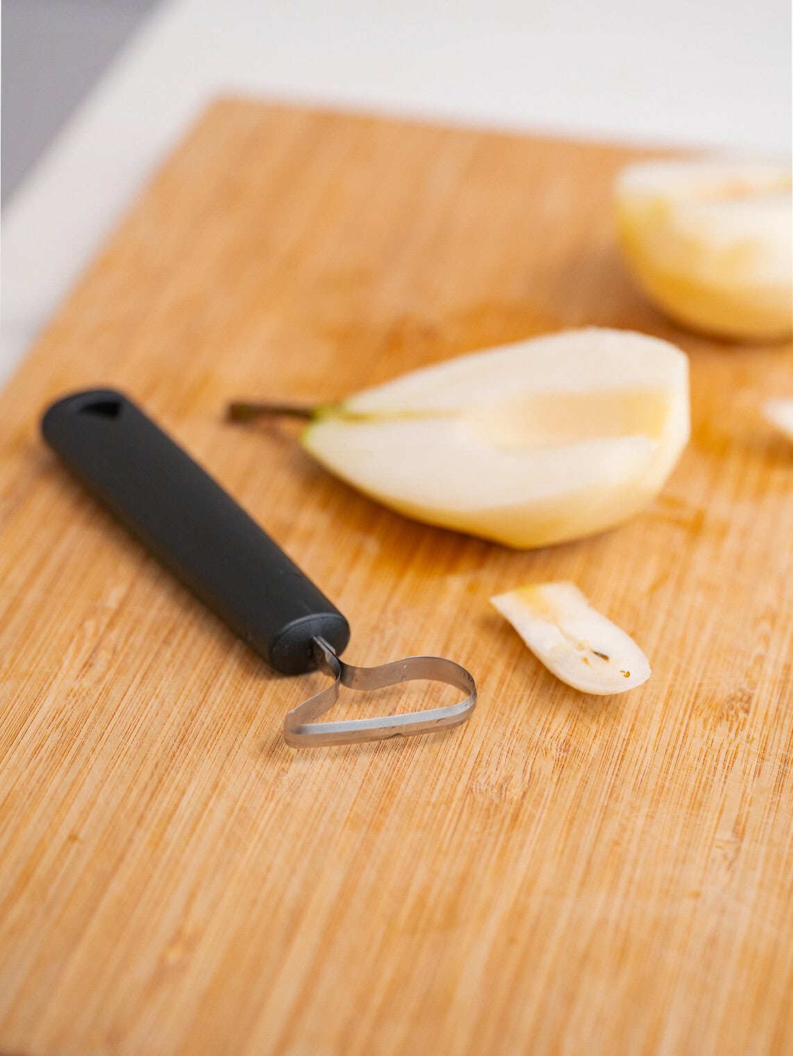 For the quick and smooth coring of fruit and vegetable. Zucchini, pears, eggplants or tomatoes can thus be effortlessly prepared for filling. The loop made of stainless steel is sharpened all around and can be applied in its full form. To be used both by lefthanders and righthanders. Dishwasher safe.