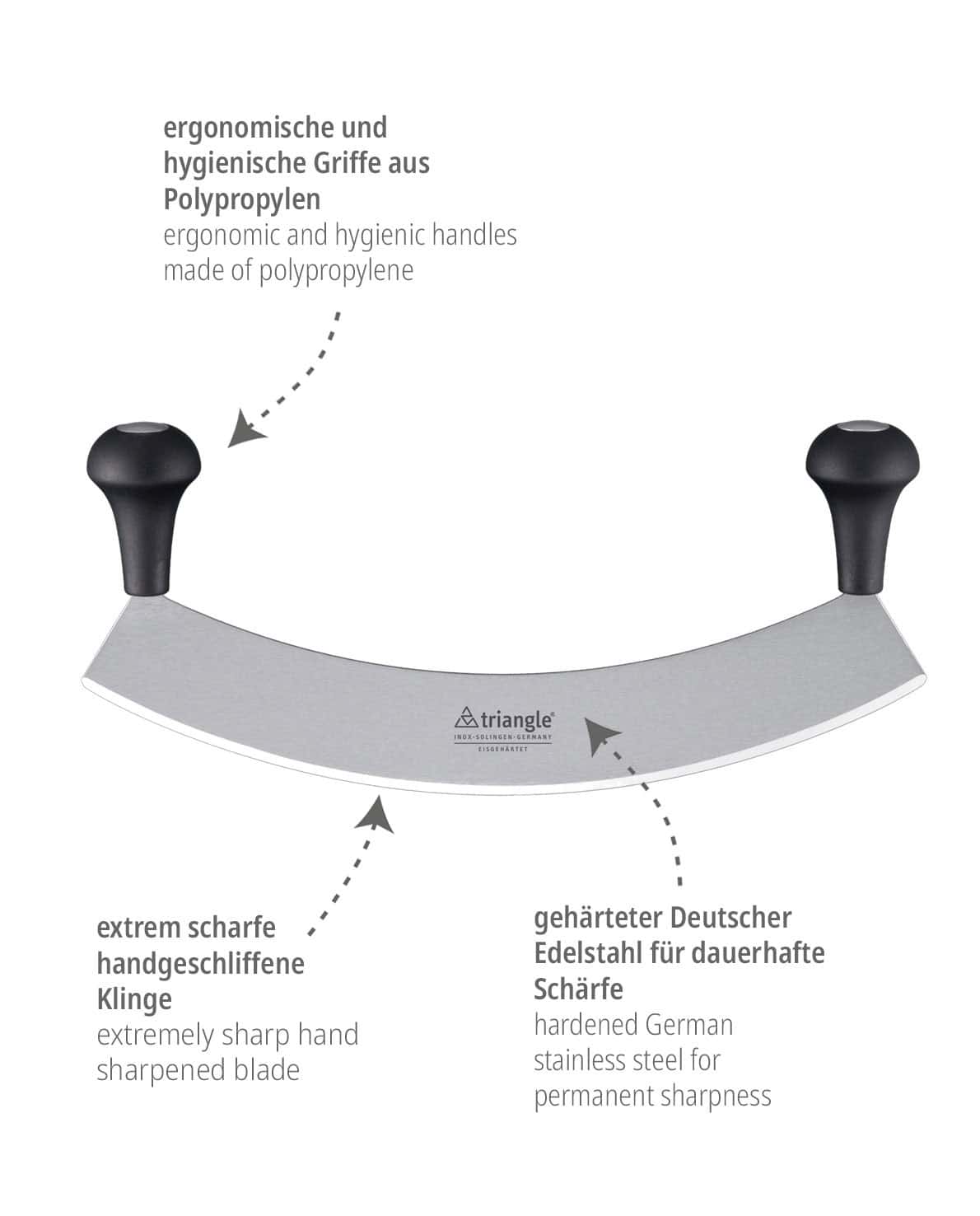 The Mezzaluna is handcrafted in Solingen/Germany and carefully sharpened by hand. Therefore, it is recommended to wash it by hand to retain its original sharpness. If desired, mincing knives with plastic handle can be cleaned in the dishwasher as well.