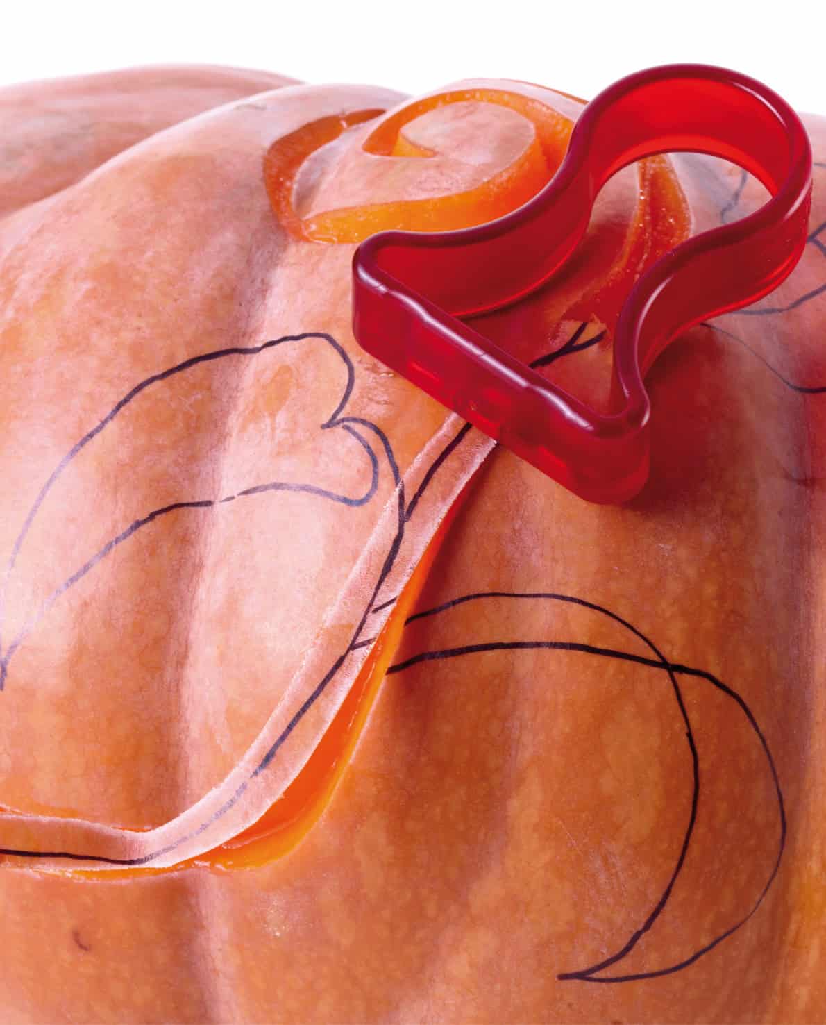 With the pumpkin carver, cut along lines drawn beforehand applying light pressure, then remove the cut out skin. Use both cutters to create 3-D effects.