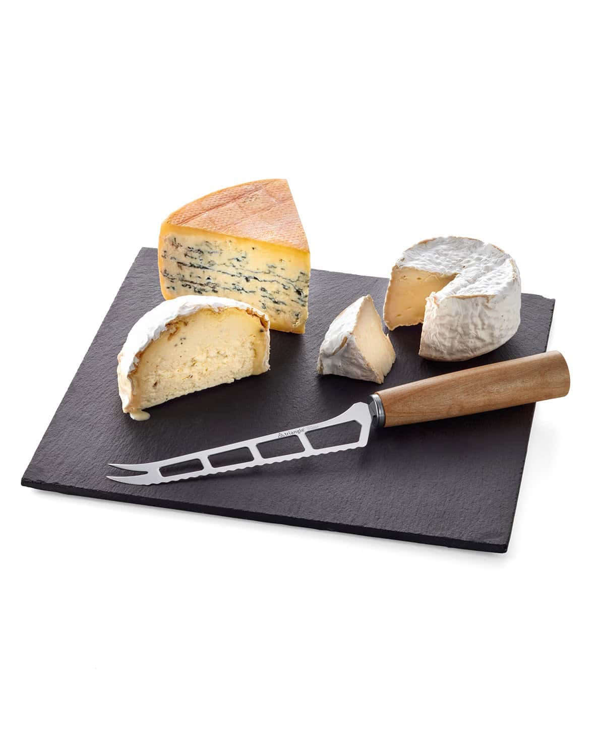 The triangle cheese knife mood features a thin, serrated blade with cut-outs to prevent cheese from sticking to the blade. The 2 tips of the blade serve as a serving fork.