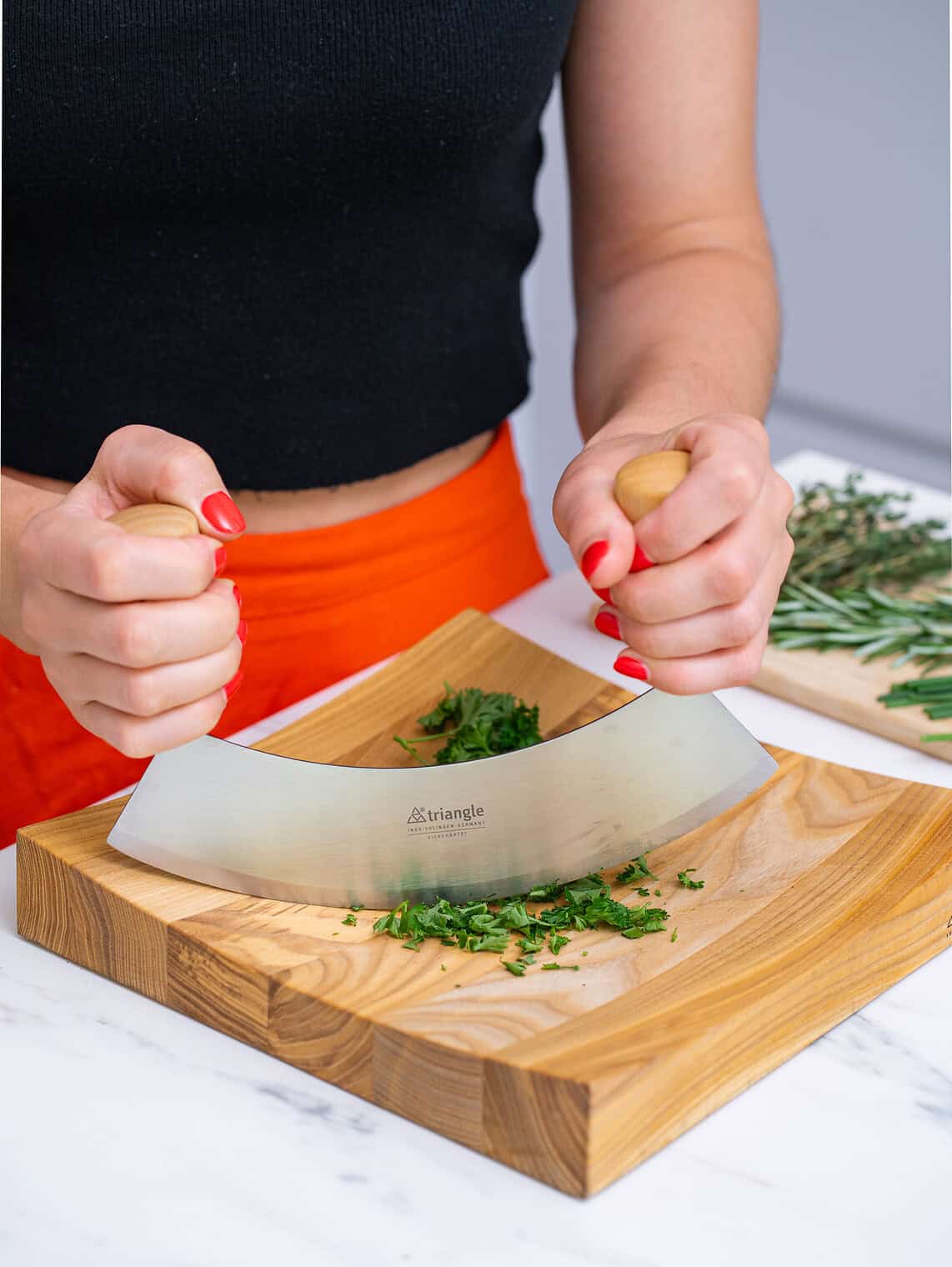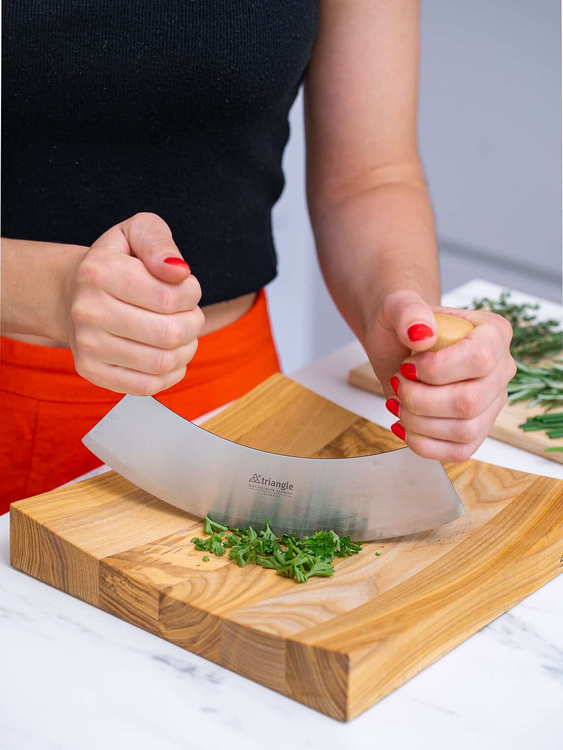 Traditionally, mincing knives are used for quick and easy chopping of herbs, nuts, garlic cloves etc. But large 23 cm models are also ideal for cutting pizza, tarte flambée and thin crust cake. And they are beautiful enough to be seen at the table.