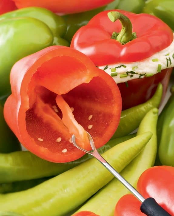 Ob als Appetithappen, Beilage oder Fingerfood – kleine Rohkost-Töpfchen, gefüllt mit einer herzhaften Kräutercreme oder pikanten Pastete, erfreuen Auge und Gaumen gleichermaßen. Mit dem triangle Deko-Twister lässt sich Obst und Gemüse im Handumdrehen in kleine Gefäße verwandeln. Den Handgriff einfach auf die Achse setzen und den Twister gleichmäßig in das Gemüse hineindrehen. Sobald die gewünschte Tiefe erreicht ist, wird das Gerät wieder aus dem Gemüse herausgezogen. Kohlrabi, Zucchini und Gurken eignen sich zum Aushöhlen ebenso wie Karotten, rote Beete oder Rettich. Zwei unterschiedlich große Aufsätze (Ø 20mm, Ø 38mm) sorgen für variable Einsatzmöglichkeiten. Alle Teile sind rostfrei und spülmaschinengeeignet. Tipp: Der große Twister hat exakt den Durchmesser eines Teelichts. Mehrer Teelichter der Länge nach in einer Zucchini oder Süßkartoffel arrangiert ergeben eine außergewöhnliche Tischdekoration!