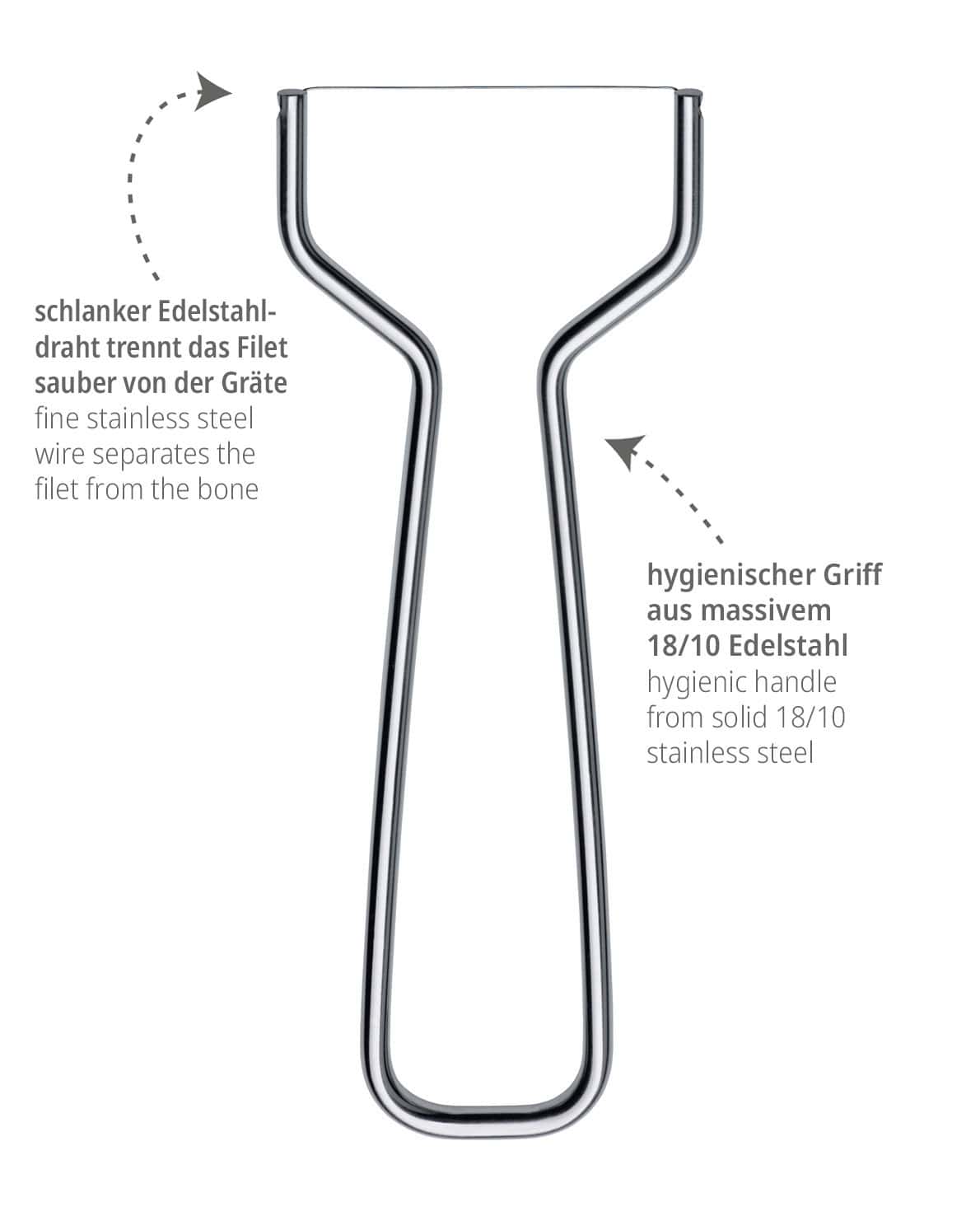 Der Sardinenfiletierer löst das Problem, kleine Fische wie Sardinen und Sardellen zu filetieren auf einfache und geniale Weise. Statt mit einer Klinge arbeitet er mit einem Draht, der die Filets von der Gräte zieht, ohne sie zu durchtrennen. Die Filets sind praktisch grätenfrei. Der Draht ist bei Bedarf austauschbar.