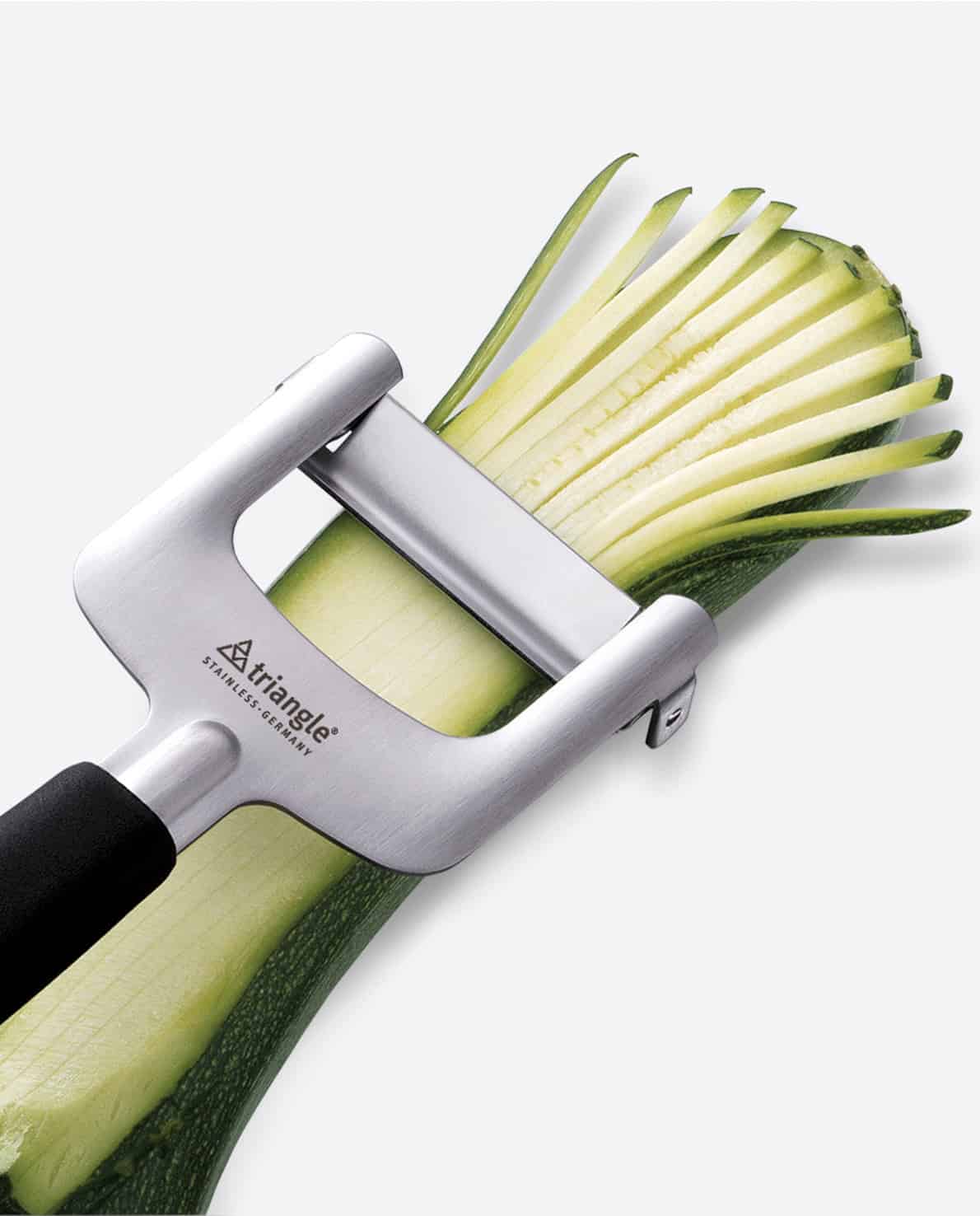 Das triangle Julienneschneider-Set schneidet Gemüse in gleichmäßige feine Julienne (3x3mm, “Spaghetti”), etwas breitere Julienne (3x6mm, “Tagliatelle”) oder 3mm dicke Scheiben. Die drei verschiedenen Klingeneinsätze sind einfach auszutauschen. Geeignet für Gemüse bis 45mm Breite.