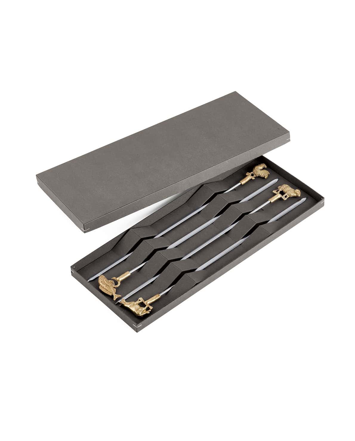 Edles und einzigartiges Grillspieße-Set aus Edelstahl mit vier Tier-Motiv aus massivem Messing. Das Set umfasst je einen Spieß mit Hahn, Fisch, Widder und Rind-Motiv. Der hochwertige Spieß mit 28 cm nutzbarer Länge ist fest und dauerhaft mit der Messingfigur verpresst. Die scharfe Spitze und der rautenförmige Querschnitt vereinfachen das Auffädeln und verhindern dass das Grillgut sich dreht. Die Motive werden in einem aufwändigen Verfahren in verlorenen Sandformen gefertigt. Erhältlich in verschiedenen Motiven, handwerklich hergestellt in Solingen. Hitzefest; Handreinigung wird empfohlen.