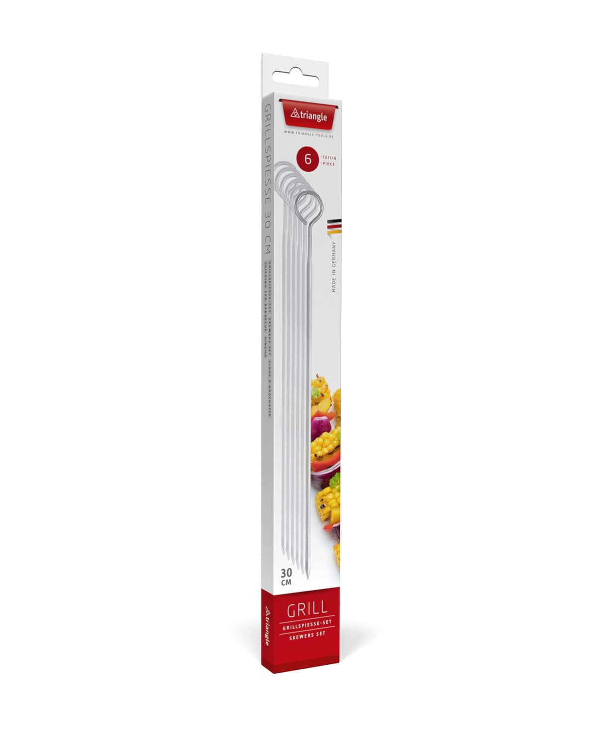 Sechs hochwertige Grillspieße aus Edelstahl mit 30 cm nutzbarer Länge.