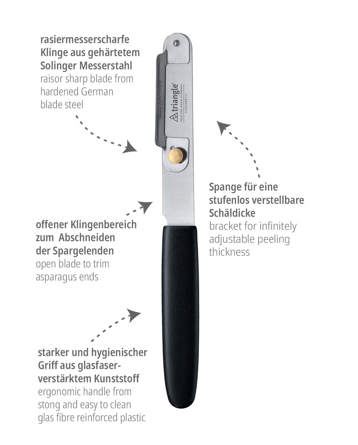 Mit dem triangle Spargelmesser lässt sich das stangenförmige Gemüse professionell und mit nur einem Werkzeug schälen und vorbereiten: Zuerst wird die bewegliche Spange entsprechen der Spargelqualität auf die gewünschte Schalendicke eingestellt und fixiert. Dann werden die Spargelenden mit dem Ende der rasiermesserscharfen Klinge gekappt. Dann wird das Schälmesser im flachen Winkel direkt unter dem Spargelkopf angesetzt und mit leichtem Druck zügig nach unten gezogen. Um Faseransammlungen zu vermeiden, empfehlen wir, das Spargelmesser ab und zu in einer bereitgestellten Tasse Wasser auszuschwenken.